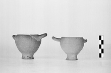 Description:   Two pieces. One handle missing. Tall flaring foot, flat underside. Triangular handles. Incurved rim.