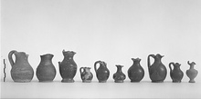 | Description: | Handle broken away. Raised base large in proportion; low swelling body; narrow neck; rim flaring out horizontally, rather wavy (opening very small); handle from lip to shoulder. Attic clay. All-over black glaze, somewhat chipped and peeled. | |