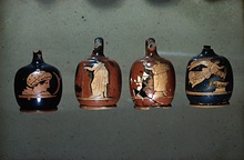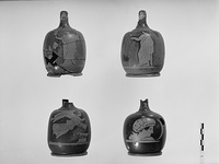 | Description: | Missing upper neck and upper handle. Low ring foot, squat body. Depicted is winged female (Nike) flying right. In her hand she holds an open chest from which she is removing a stephane(?). Below chest is low altar with Ionic volute. Partially fired red. Red clay. | |