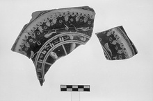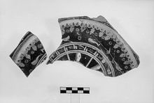 Description:   Part of a flat plate, decorated in white and yellow. Outside, dots; a zone of wave pattern; palmettes, rosettes and dolphins. Inside, with concentric grooves, pairs of parallel horizontal and vertical lines alternating, and radiations, mostly destroyed. Heavy, grooved, ring base. No rim preserved.