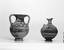 Description:   Complete except for small chips; very worn. Flaring base ring, round body, wide neck, flaring rim, flat on top. Two handles, oblong in section. Lower body: two reserved bands. Upper body: two reserved bands. Shoulder reserved, decorated with nine groups of decreasing lambda-shaped patterns, three or four lambdas per group. Neck glazed. Underside of foot reserved. Badly peeling brownish glaze.