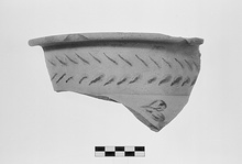 | Description: | Part of the flat out-turned rim, the straight neck, and a bit of the shoulder preserved. Pink rather micaceous clay, with a buff slip. On the neck an ivy wreath; on the shoulder two large rounded leaves. Unglazed. | |