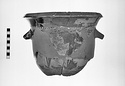Flaring rim with flat top sloping outward, reserved bands at lip and below lip inside. Below offset of rim is a band of ovoles. Lug handles.