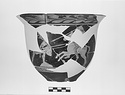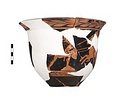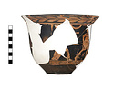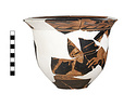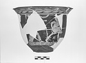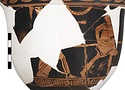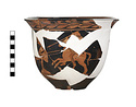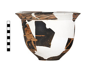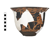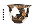 | Description: | Mended from many pieces. Foot missing. About half of walls missing. Nearly all of rim preserved. Flaring offset rim with top sloping outward, reserved bands at rim and below rim inside. Rim has laurel wreath. Below it a reserved band. A) Mounted Amazon rides left toward hoplite. Amazon armed with spear. She wears a spotted cap, a skirt and striped trousers. The hoplite, who stands with left foot upon a rock, wears greaves, cuirasse, and Attic helmet and is armed with spear and shield. Elaborate spiral pattern on cuirasse done in relief line visible inside of shield. B) At right, a figure striding to right, looking back to left. An Amazon, she wears a skirt, jacket and trousers and cap, and carries spear in her right hand, a lunate wicker shield in her left hand. To left are traces of the feet of a trousered figure walking to right. Possibly a scene of Amazons setting out. Ground line is maeander and saltire squares. Black glaze inside and out. Orange clay. | |