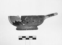 | Description: | Mended from three pieces, about one-third of rim missing. Ring foot convex on outside. Rim slopes inward. Triangular handle. Underside glazed, resting surface reserved. Glazed red to black, peeling. Orange clay. Cf. Agora XII, no. 760, 375-350 B.C. | |