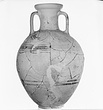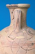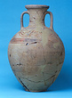 Description:   Mended from many pieces and restored in plaster. Simple foot with flat underside; slightly uneven ovoid body. Strap handles, profiled lip. Two lines below belly; shoulder is main area of decoration. Three bands at bottom. Above these on each side are two spirals. On handles, a cross, which continues down ending in a loop on either side of handle. Band on inside and outside of lip.