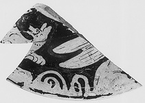 | Description: | The larger fragment preserves part of the overhanging rim, with large egg and dot pattern. On the top are, at the left, the forepaws of a seated panther(?), next, a plant conventionalized to a spiral, and to the right the wings and hindquarters of a seated sphinx or griffin. The small piece preserves a griffin's head, and a bit of the reserved area around the handle. Poor glaze; no contours. The inside of the lid glazed. | |