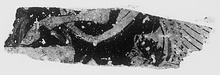 | Description: | From the wall of a krater. At the right, the head, left, and part of the wing of Eros(?). At the left, on the level of this head, the hind leg of a rearing horse, and part of a chariot wheel(?). The horse's foot is about to rest on a square reserved area, at the lower left edge of the fragment. Streaks of white paint, suggesting flames, and suggesting an altar, rise from this object. Relief contours for horse, wheel and altar; none for the winged figure. White wreath, once gilded, for this figure. | |