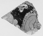 | Description: | Wall fragment of a bell krater, near the rim; good black glaze inside. Mended from 3 pieces. To the right is what appears to be the arching neck of a horse, with his mane and right ear. Above in the field, a trefoil-shaped object, in heavy white overlaid with dilute glaze to give the effect of gilding. No relief contours; the inner drawing of the horse done in relief lines. Late Meidian. | |