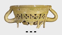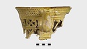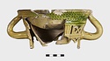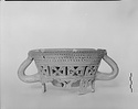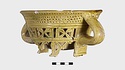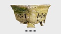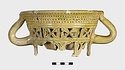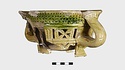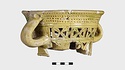 | Description: | Brittle white clay; light green glaze darker in places; fired yellowish-brown where lines or dots have been incised. A triple affair, the outer part of which has an elaborate cut out pattern; its lowest part is nowhere preserved. A square opening on one side gave access to the middle part, in which fire of some sort was put, for there are distinct traces of burning. A row of holes about the top of this part let off the smoke. The third or upper part is the bowl proper; it has seven concentric rings in low relief at its center. Two heavy vertical handles. | |