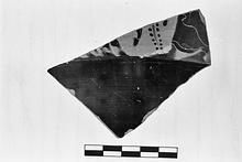 | Description: | Fragment preserves lower portion of horse to left, one hoof raised, and woman right facing horse (drapery and white feet). Incision on drapery. Good black glaze below figural scene. Interior good black glaze. Attic. ADDENDA More than one horse. Chariot to right. This is too small to be a calyx krater. It is probably a chalice. MBM. | |