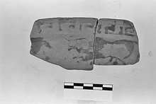 Description:   Two joining fragments from wall of vessel with rim preserved. Key, two animals confronted (one a bull?) below.