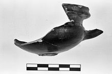 | Description: | Stem, handles, three-quarters of upper body missing. Low upper wall with moulded rim. Rouletting on floor. Orange clay; black glaze outside, mottled brown to black inside. | |