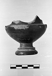 | Description: | Foot and lower body. Moulded foot with scraped groove in resting surface. Concave underneath. Scraped groove between mouldings of foot. Fairly high, thin stem. Dull black glaze. | |