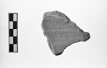 | Description: | Fragment of a large coarseware open vessel. Inscribed on both sides. a) Outside: <graphic> b) Inside: <graphic> Buff Attic clay with inclusions. Cf. P 15555, P 15379, P 31078. | |