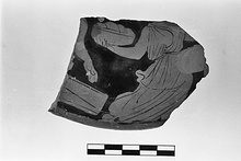 | Description: | Broken on three sides. Lid with scene depicting woman running right, holding basket in right hand. At left, the right arm of another figure, reaching down towards a rectangular object. Edge of lid reserved with ovolo pattern in black. Attic clay. | |