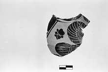 | Description: | Broken on all sides; three joining fragments, perhaps from miniature amphora, oinochoe or hydria. In panel, siren (back of head, some of wing, tail), to right. Red for forepart of wing, bar on tail. Attic. | |