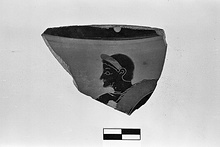 Description:   Broken all around. Thin brown glaze on inside. Youth (head, shoulder) standing to left on the left hand side of a horse to right (mane, some of neck). Above, top of panel.