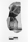 | Description: | Fragment of upper body with beginning of shoulder preserved. Body wall nearly vertical. Figural zone delineated by a double row of dots and two narrow bands below shoulder, and by two narrow bands flanking a broader one at the bottom. Two horses' heads in profile face right; four horses are represented, as shown by the eight forelegs. Added red for manes and collar. | |