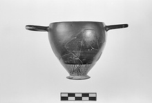 Description:   Mended from many pieces, preserving lower part of body and foot. Corinthian skyphos with net pattern around base.