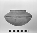 | Description: | Mended from many fragments, preserving complete profile. Parts of rim and body missing. Globular pot with rounded bottom, slightly out-turned rim. No evidence of a handle. Unglazed except for dark red wash in stripe around maximum diameter, and dark red wash inside. Attic clay. | |