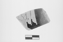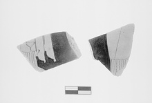 Description:   Two non-joining fragments from the body of a closed vase - stamnos? A figure in chiton and mantle; both fragments may show the same figure.