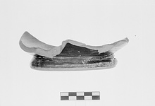 | Description: | Three non-joining sections. a) Preserves over half of rim, with handle. b) Floor. c) Rim fragment with handle scar. Ring foot, rounded, reserved resting surface. Projecting rim, rounded on top. Handle joined below rim. Handle panel reserved. Shiny black to brown glaze. | |