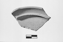 | Description: | Rim fragment. Plain rim with flange on inside to receive lid. Shallow body. Surface of floor lightly striated. Micaceous clay with voids, small black inclusions. Some fine white inclusions. 5YR 6/6. | |