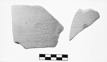 | Description: | Two non-joining fragments, with part of edge preserved by a). Wheelmade body with plain, flat edge, and feather pattern on upper surface, stopping and bordered by fine line 0.042m. from edge. Fine, soft, slightly micaceous clay. 5YR 6/6. | |