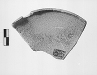 | Description: | Ca. one-quarter of rim and part of wall. Vertical rim, offset from convex top. Slight striations on upper surface. Some burning on upper surface. Micaceous, fine hard clay with fine black inclusions and large gray and white inclusions. 7.5YR 6/4, partly fired gray. | |
