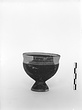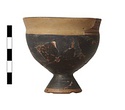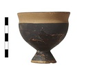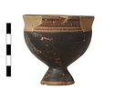 | Description: | Small footed cup. Rather less than half preserved. The shape similar to P 3171 but no trace of handles. Decoration only on offset lip, between lines a chevron pattern. Reserved line inside lip, and reserved circle at center of interior. Reserved also at bottom of low conical foot. Light buff clay; black glaze. | |