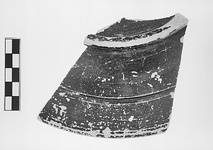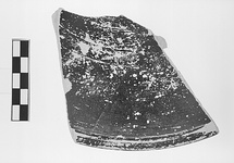 | Description: | Ca. one-sixth of foot, wall and rim preserved. Ring foot with bevelled resting surface. Nearly straight walls with glazed groove on outside, just above mid-height. Thickened, rolled rim. Metallic black glaze. | |
