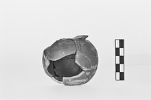 | Description: | Mended from many pieces; round in shape. No handle or neck existed. Around the small round mouth, a groove. Incised net decoration. Dark red glaze. | |