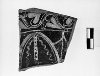 Description:   Broken all around. Fragment probably from a reversible lid. Inner register: broad lotus petal with incised outline and painted details; to right, painted, pointed lotus petal. Outer register: ivy garland with main stem painted white, stems of leaves incised. Ivy leaves in applied clay, dot rosettes in white. Registers divided by incised line.