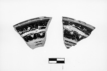 | Description: | Two non-joining rim fragments. Broad rim, convex on top, with two ridges at outer edge. Rim set off from floor by deep groove and pronounced ridge. On rim, ivy garland with thick stem, highlighted in white ivy berries represented by three white dots. Shiny brown to black glaze. | |