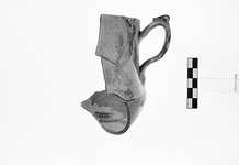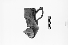 | Description: | Seven joining fragments preserving one-fourth of upper wall, one handle, one-fourth of lower wall. Foot missing. Angular kantharos with concave upper wall meeting convex lower wall. Partially scraped groove just above point of greatest diameter. Strap handle with ivy leaf thumb rest. West Slope decoration: incised wave pattern with hanging fillets at side. Glaze mottled from red to black, peeling. | |