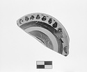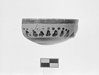 | Description: | Two joining fragments preserve one-third of bowl; foot and handles missing. Rim slightly out-turned. Black inside except reserved band at lip. Outside: rim black; in handle zone a band of "buds" composed of large and small black blobs. Added red dots on large blobs, added white dots between. Below black band and reserved band on lower wall. Orange-buff clay; dull black glaze. ADDENDA Very close to P 12565 (G 11:3); P 20766 (R 12:1). | |