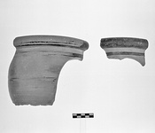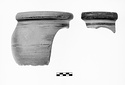 | Description: | Two non-joining fragments preserve parts of rim and upper bowl. Slightly bulging wall; heavy rolled rim; oval cutout in wall for baby's legs. Glazed are: rim inside and out; a band below rim, a band at mid-wall. Fragment a) preserves beginning of seat on inside. Pinkish-buff clay. Brown to black glaze, worn. Cf. Agora VIII, no. 600 (7th c. B.C.). Cf. Hesperia 17 (1948), pl. 65:2-3 (6th c. B.C.). | |