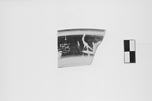 Description:   Single rim fragment from conical cup. Plain rim with scraped groove on inside. Glazed band above, with reserved band and groove below. On glazed band, a double cornucopia, its body originally white, with three sprouts across top and fillets hanging from either side. At right, bunch of grapes with tendrils and leaf.