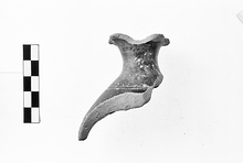 | Description: | Neck, half of rim and part of shoulder preserved. Sloping shoulder with groove at top. Short, thin neck. Flaring rim. Strap handle attached below rim. Shiny brown glaze outside and upper inside. | |