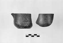 | Description: | Two non-joining sections. a) Half of bottom, one-third of wall and rim, base of handle. b) Part of wall and rim. Flat bottom. Lower wall faceted, upper wall slightly concave. Loop handle attached at rim. Finger marks on lower body. Shiny brown glaze. | |