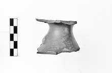 | Description: | Filter jug. Part of shoulder and neck preserved. Horizontal shoulder with ridge at top. Strainer in neck, with six holes around outside. Funnel mouth with widely flaring rim. Groove inside rim. Triple handle attached well below rim. Hard, somewhat shiny red glaze (2.5YR 5/8). Hard, fine clay with many very small dark inclusions; lighter than 2.5YR 6/8. Pergamene Sigillata? | |