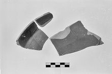 | Description: | Two joining rim to base fragments, one loose rim and a base fragment. Center lost. Wide-based type with low curved rim; low foot. Pair of rouletted circles on floor. Dullish red gloss, slight double-dipping streak. Eastern Sigillata 'A' ware. | |