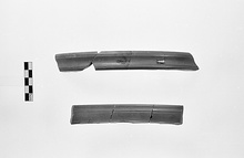 | Description: | Two large pieces of rim (each of 4 joining sherds). Vertical rim with concave moulding between grooves; similar moulding plus groove on upper interior. Edge of a flat floor. Smooth pinkish-red clay, hard dull red gloss. Italian Terra Sigillata. | |