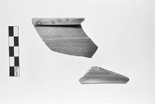 | Description: | Fragment of top of 'hole-mouthed' jar. Jar with raised rim and mouldings on shoulder, with rouletting in the hollows. Smooth brown ware, rather metallic red-brown slip on exterior. Same ware as P 31993 (or P 31994?) | |