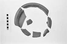 | Description: | Three non-joining rim fragments (a, with edge of floor, b, mended from two pieces) form half of rim and wall. Also, a non-joining floor fragment. Flat floor with slight foot at edge, defined by grooves; low steep wall, ending in a down curved rim, grooved on top. Three lines of coarse rouletting preserved around missing central part of floor (g). Orange ware; orange slip, polished and glossy on inside. Inner surface badly spalled as is edge of base. Ware related to Knidian (cf. ΑΤΤΙΚΩ dishes), form copies E. Sigillata B2 ware, of ca. AD 100-150. | |