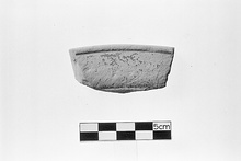 | Description: | Rim sherd of platter, flat, with shallow convexity on top; thick flat lip, with grooves marking off lower edge. Light yellow-brown clay; red gloss, almost all peeled off on top. Early Arezzo (Cincelli) product? Early Italian Terra Sigillata(?). | |