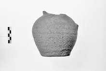 | Description: | Body preserved intact but handle missing and neck broken off at base. Flat bottom, globular, ribbed body. One strap handle attached below shoulder. Three incised grooves at base of slightly flaring neck. Orange clay, with pitted surface. Cf. Hesperia Suppl. 5 (1941), p. 5, fig. 1 (Grave 10). Byzantine (10-11th Century). | |
