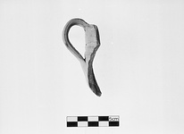 | Description: | One side, to just above base, with handle. Steep-sided, curved in at bottom. Upper part ribbed. Thin strap handle, concave in section, looped from rim to body. Gray-cored, fired brown at surfaces; brown wash in places. Burnt material adhering to interior. Related to Knidian fabrics? 6th c. context-residual? Import (Roman). | |