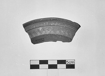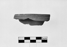 | Description: | Piece of rim. Small bowl with wide tilted rim, ending in vertical hanging lip bearing two grooves. On top of rim, two grooves and uneven line of rouletting. Red clay; red slip, thin on exterior. Hayes form 70/74 variant. African red slip ware | |